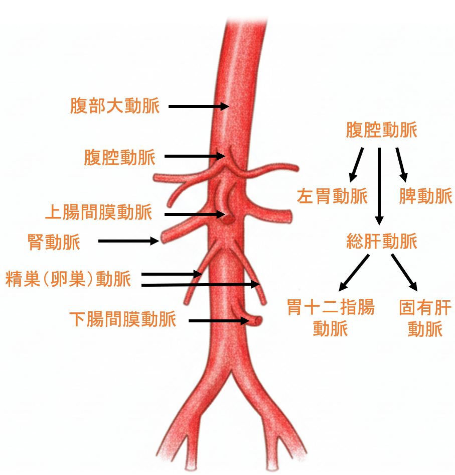 腹腔動脈+上腸間膜動脈+下腸間膜動脈+精巣(卵巣)動脈や肋間(下)など+左右の総腸骨動脈